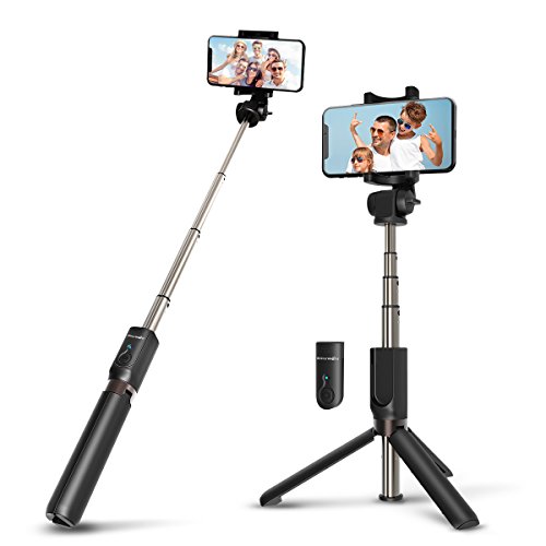 - SELFIE STICK WITH WIRELESS REMOTE -- 3 in 1 selfie stick tripod with built-in remote (max:33ft ), allows you to take selfie-photography or you could separate the controller to take group photos like parties, graduation, wedding, travel.The remote control device is located on the selfie stick by the handle. It can be removed from the holder on the selfie stick to being used independently.(Note:The remote is attached to the selfie stick, not in the box alone.)