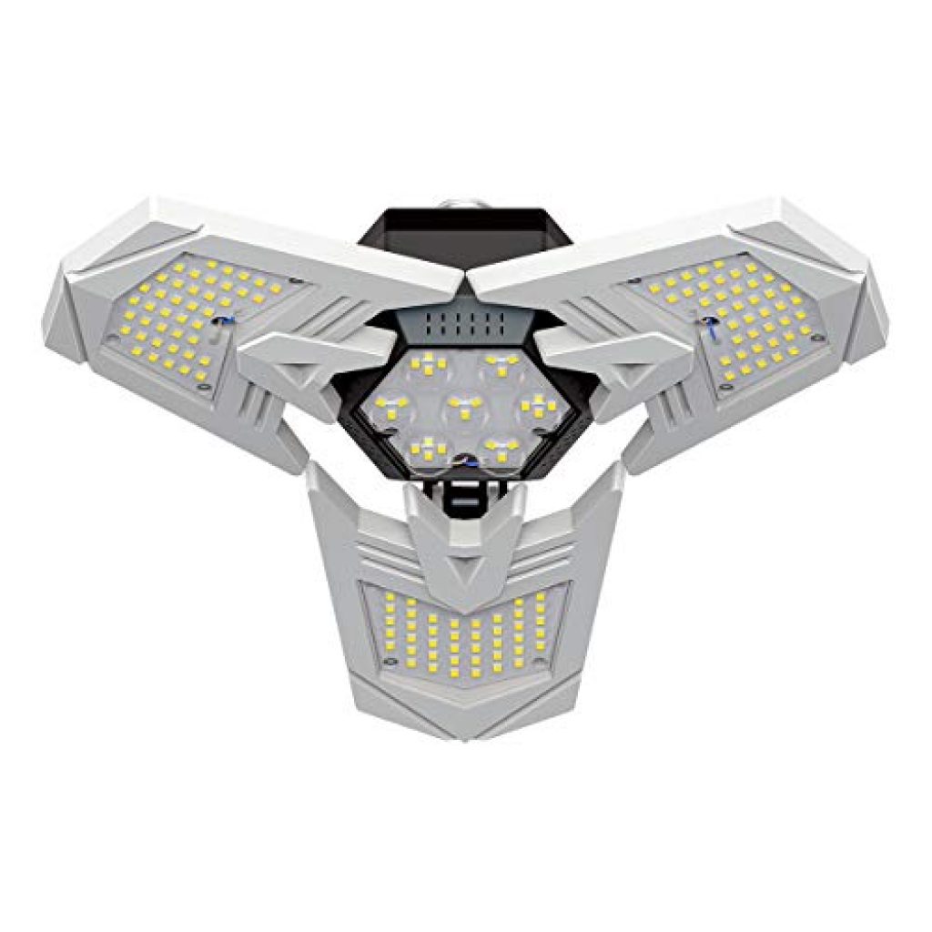 - 【10000 Lumens More Brighter】-The newly upgraded four-side lighting LED garage light, which uses 3*48 top-quality diodes and 24 high-quality lamp beads with astigmatism design, a total of 168 LEDS can reach four-side lighting. The maximum brightness is 10,000 lumens, and the brightness is 1.2 times that of the 80w three-leaf LED garage light. It provides you with a brighter space and makes your garage or warehouse look very good and bright.