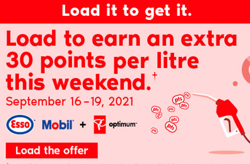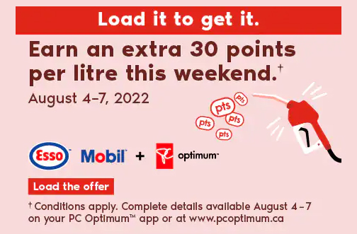 This weekend you can earn bonus points on fuel! Earn 100 points for every litre of gas purchased when you swipe or scan your PC Optimum Card at Esso or Mobil Gas stations.