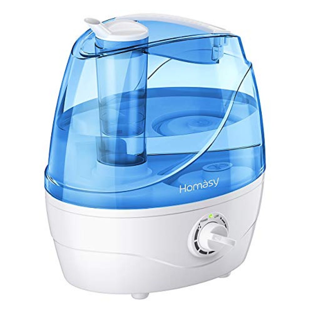 - ♥Improved Humidification♥ Homasy 2.2 L/0.58 Gallon humidifier features 45° titled nozzle that can swivel 360°, together with optimized air passage which helps to effectively spread the mist throughout your space. Perfect for spaces up to 300 ft² (28 m²) like bedroom, office, living room, nursery, etc.