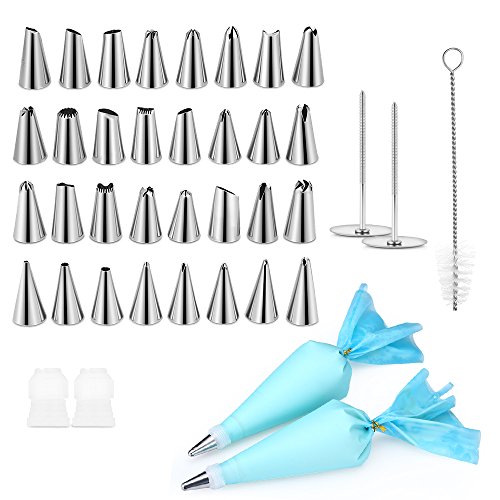 - Cake decorating kits: 32 stainless steel icing tips, 2 reusable silicone pastry bag, 2 reusable plastic couplers, 2 flower nails, which you can create all types of patterns on cake, cupcakes and cookies