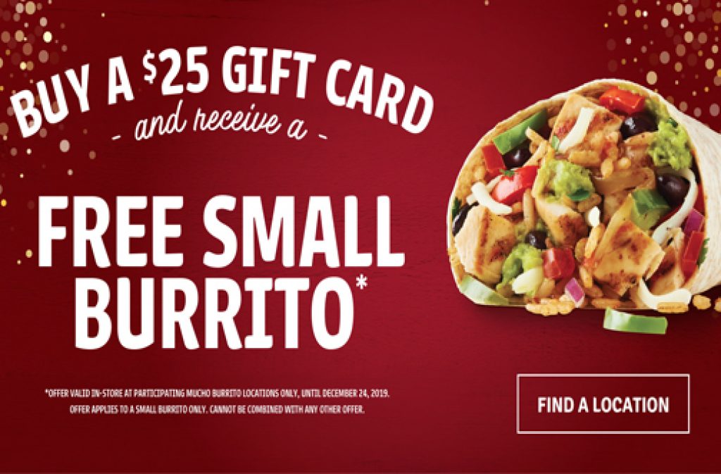 For a limited time, buy a $25 Mucho Burrito Gift Card and get a FREE Small Burrito for yourself!