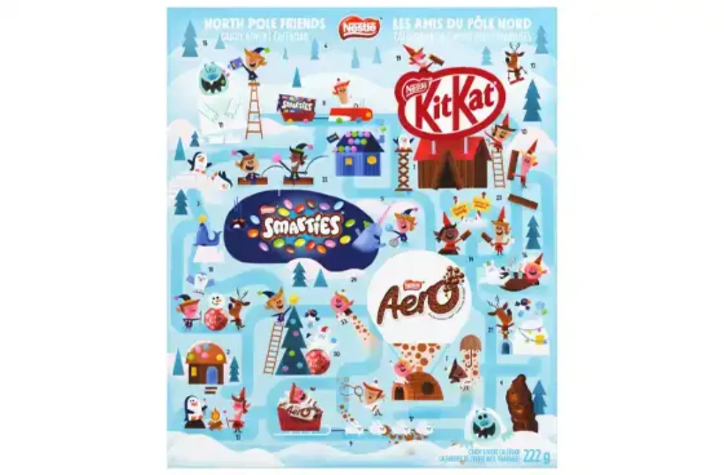 - Christmas Chocolate Fun: Behind each of the 24 doors of this advent calendar is either a KITKAT Mini Bar, SMARTIES, a KITKAT Bubble, an AERO Mini Bar, or a KITKAT Santa