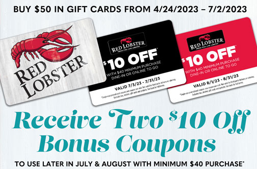 Purchase a minimum $25 Red Lobster Gift Card and receive a $5 off Bonus Coupon to use on your next purchase.