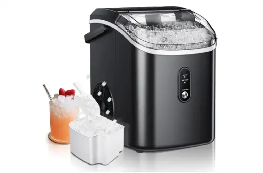 The Simzlife nugget ice maker produces soft, chewable ice in 6–8 minutes. With a 1.2Qt tank, it yields 34 lbs/day via a 1.8 lbs removable basket. Safe for hands/mouth, its pellets cool drinks, coffee, or snacks. Compact and portable (sturdy handle, lightweight), it fits homes, offices, or camping. Features scoop holder, viewing window, and smart "ICE FULL"/"ADD WATER" indicators. Operates <50 dB, auto-cleans in 15 min, and uses ~3 kWh/day.