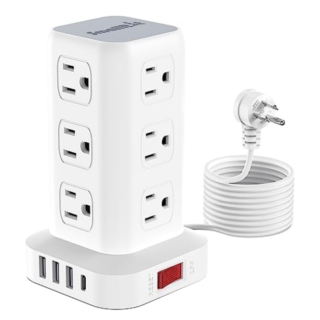 - 【16 IN 1 Surge Protector Tower with USB】- This power strip tower surge protector with 12 AC outlets and 4 smart USB can power up to 16 electronic devices simultaneously. Integrated circuit breaker and 1200 Joules protection rating ensure the safety of your electronics.