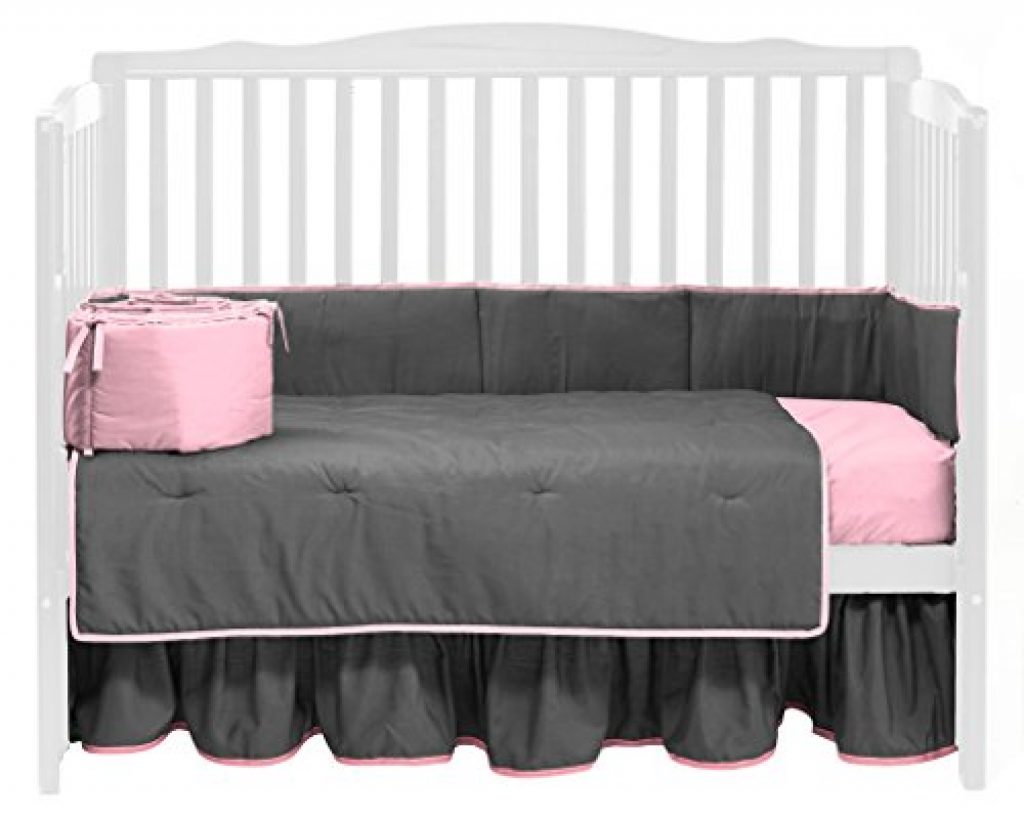 Redecorate your baby’s nursery with this solid reversible crib bedding set available in grey and pink.